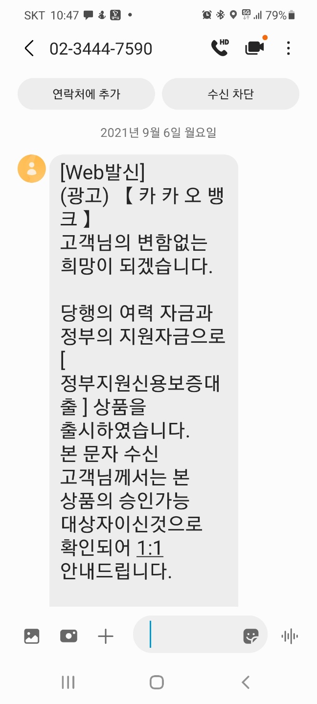 당행의 여력 자금과 정부의 지원자금으로 [ 정부지원신용보증대출 ] 상품을 출시하였습니다. 본 문자 수신 고객님께서는 본 상품의 승인가능 대상자이신것으로 확인되어 1:1 안내드립니다.