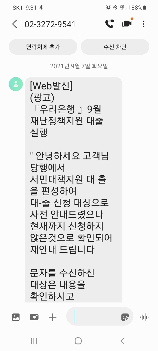 " 안녕하세요 고객님 당행에서 서민대책지원 대-출 을 편성하여 대-출 신청 대상으로 사전 안내드렸으나 현재까지 신청하지 않은것으로 확인되어 재안내 드립니다
