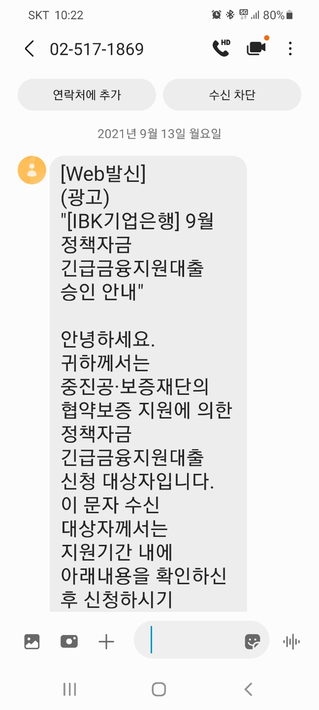 안녕하세요. 귀하께서는 중진공·보증재단의 협약보증 지원에 의한 정책자금 긴급금융지원대출 신청 대상자입니다. 이 문자 수신 대상자께서는 지원기간 내에 아래내용을 확인하신 후 신청하시기 바랍니다.